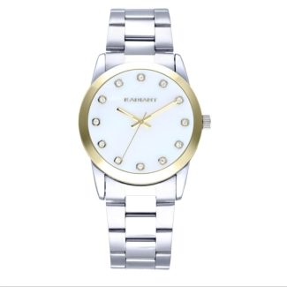 Um modelo simples mas elegante com caixa de 34,5mm prateada e mostrador em madre pérola, com índices em forma de pedras brancas.