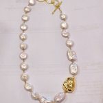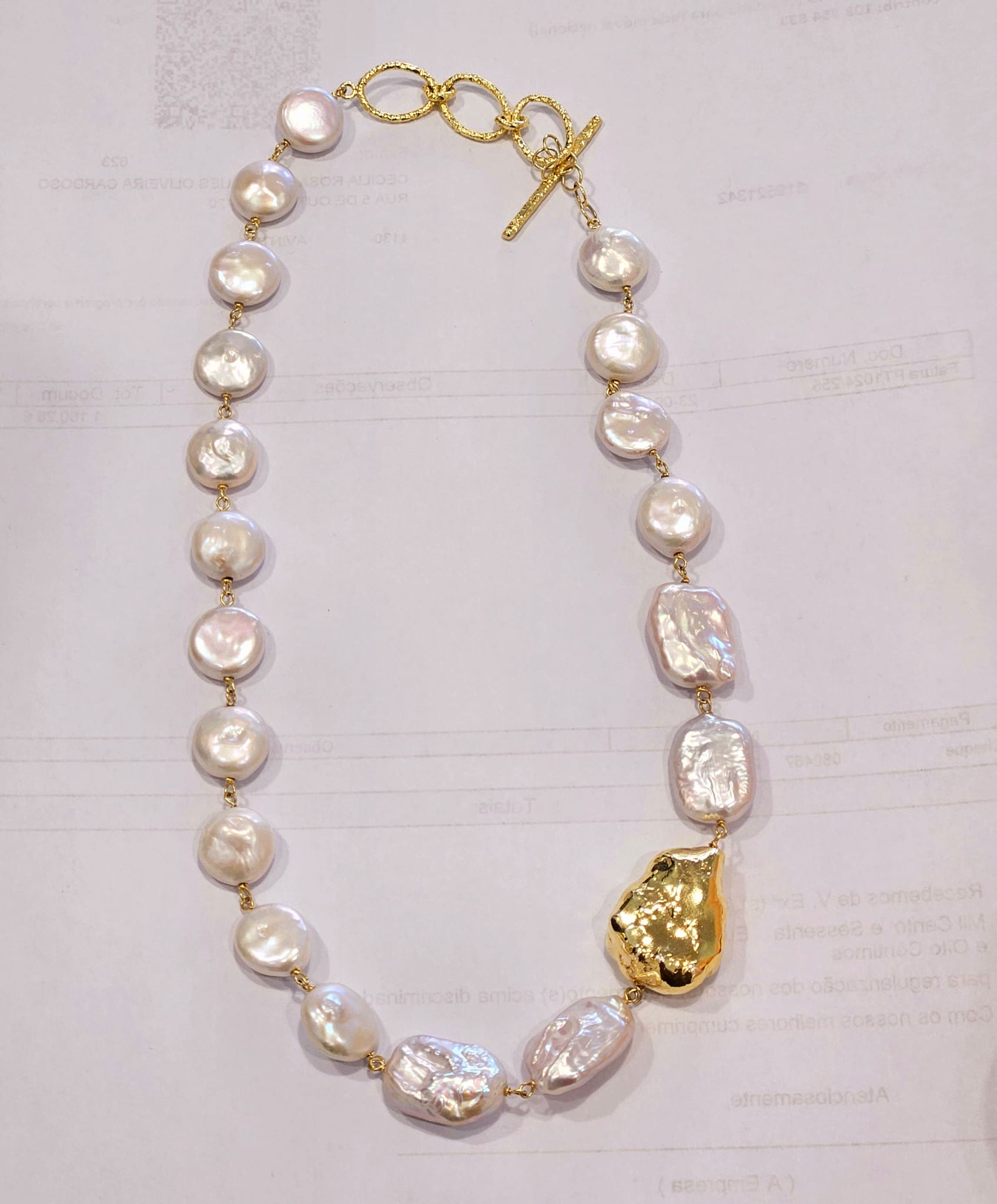 Colar de perolas com pepita em Prata Dourada; tipo de fecho: travinca; comprimento(cm):45+3;
